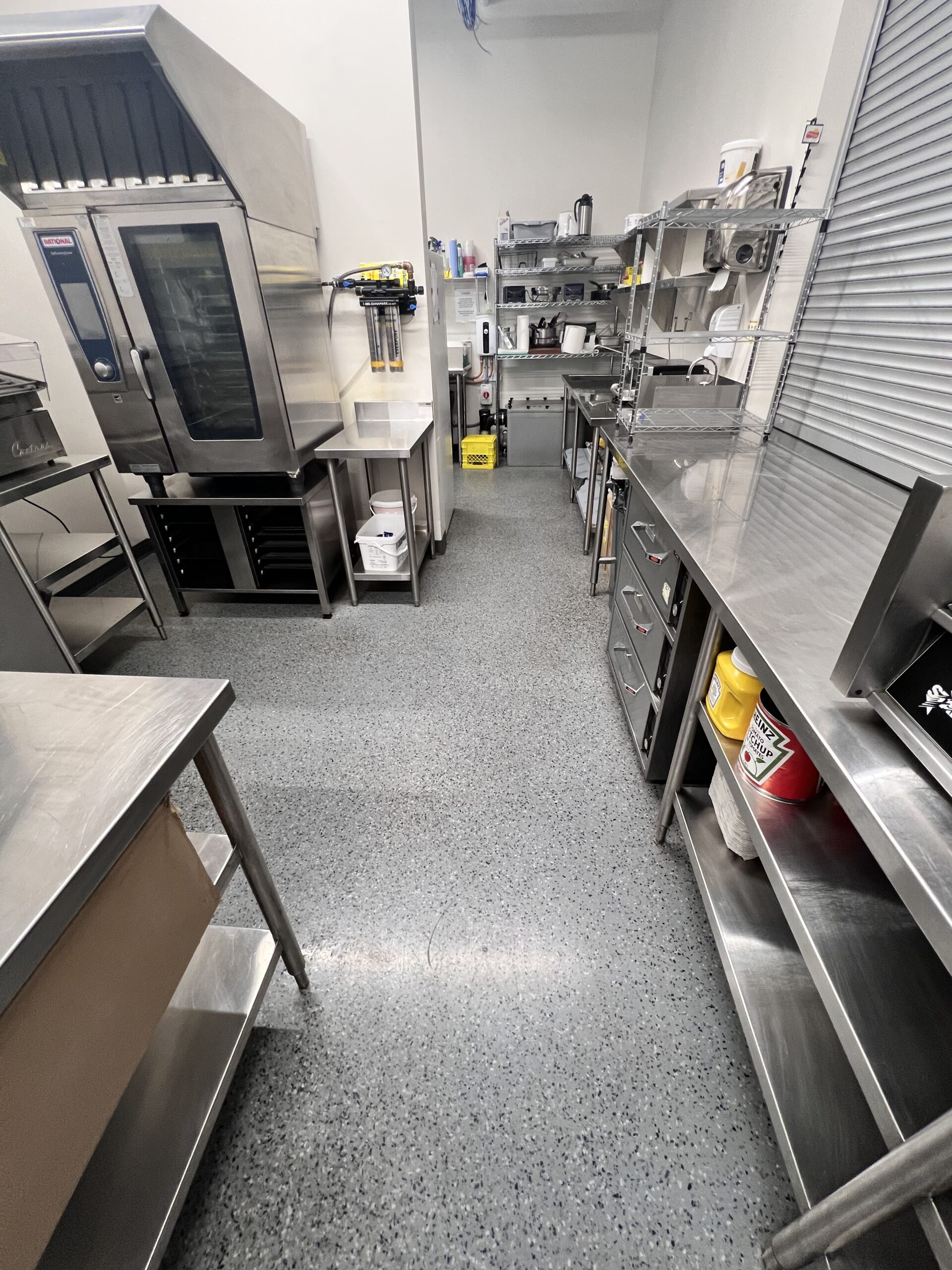 The scope of work included the preparation of existing floor surfaces and the supply and installation of a high-performance epoxy flooring system across three concession locations, covering approximately 1,050 square feet. The new flooring system was selected for its durability, slip resistance, and ease of maintenance.